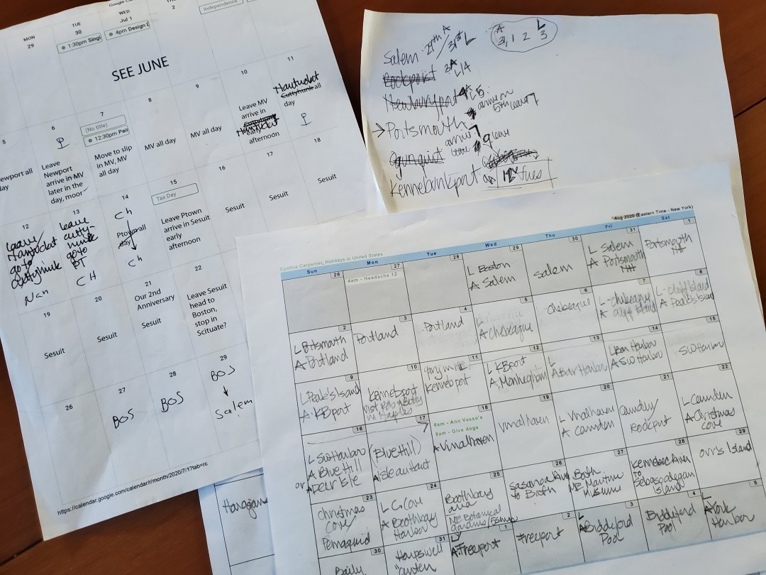 Both of us are from Cape Cod, so in our discussions it seemed logical to travel up the east coast to New England, stopping briefly along the way as needed for provisioning, pump-outs and some cautious, mask-wearing, social distancing sightseeing. In any case, we decided we would spend the bulk of the summer around Cape Cod, Boston and Maine. Once we had the big picture now – in my mind, we had to figure out the details i.e.: how were we going to get there? Which ports along the way did we want to stop at? I couldn’t just leave willy-nilly without a plan or an agenda! So, I sat down one afternoon with Google maps and blank calendars for the months of June & July open on my monitor. I figured I’d start with planning for the first two months. That would get us going and we’d proceed from there. I worked my way up the east coast states taking guestimates of mileage between ports and creating a schedule on these blank calendar pages. Then on June 3rd in the middle of a thunderstorm, mid-morning we slipped out of our comfortable berth and headed upstream. Not ever having done any of this before I quickly learned what factors I didn’t account for in my typed plans. Delays or “schedule changes” due to: weather / wind, liking a place, not liking a place, taking longer to get to a port due to timed bridge openings, booked marinas, running aground, tides making passages impassable, timing to catch the right current, waiting for packages to arrive, etc. rendered the schedule obsolete rather quickly. However, not daunted and armed with my newfound knowledge I wrote out the next three calendar months in pencil. As we went along, at first, we started erasing and revising the calendars sometimes crossing out and writing over and then eventually giving up all together using them only as suggestions for ports we may want to visit. By the time we were heading from New England back to Florida in October, I had given up all semblance of making plans because I learned at the end of the day it really didn’t matter where you were as long as you were safe and secure. With Luke doing the navigating he took over planning. Instinctively, he knew how far he wanted to travel, where he might want to stop for the evening, etc. So, in the morning on a day of departure, we’d discuss where we were heading, what route we thought we were taking, and how long we thought it would take. Then later in the day we’d update with where and how – dock, anchor or moor, we’d secure for the night.