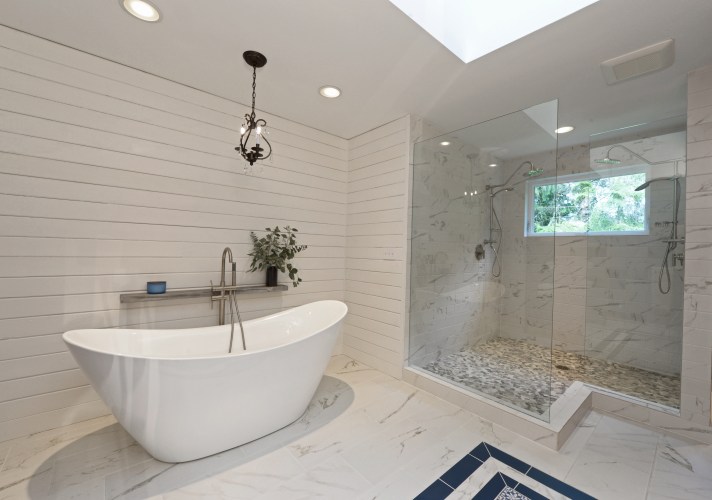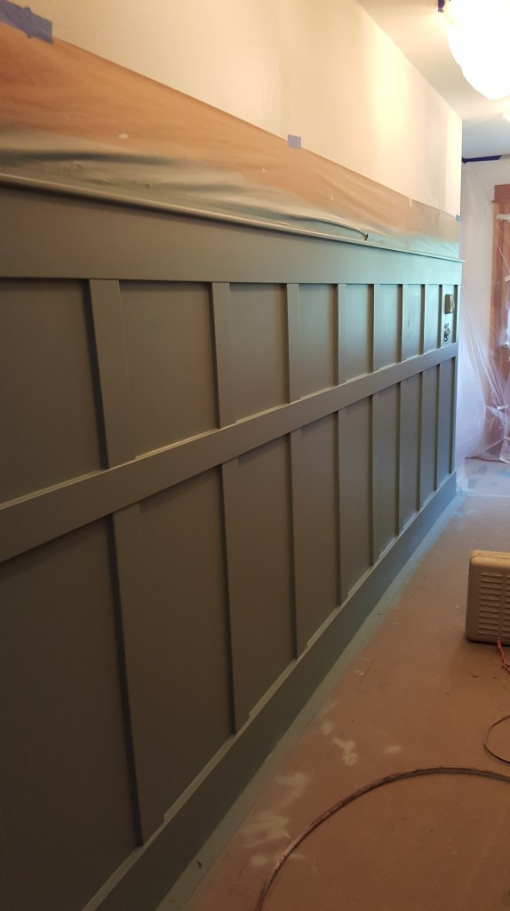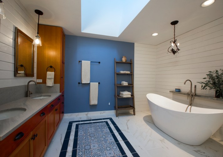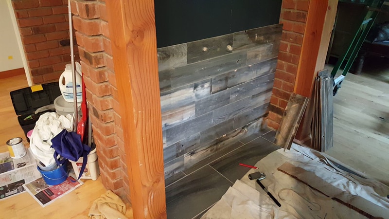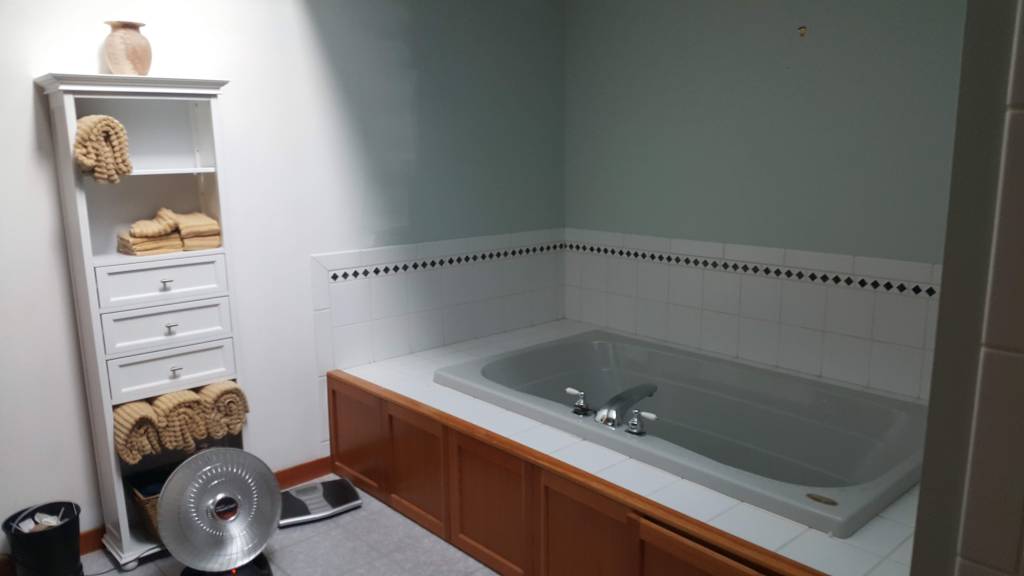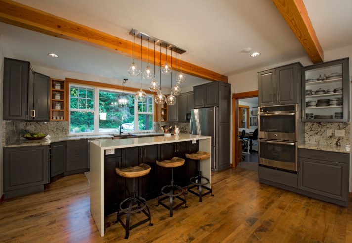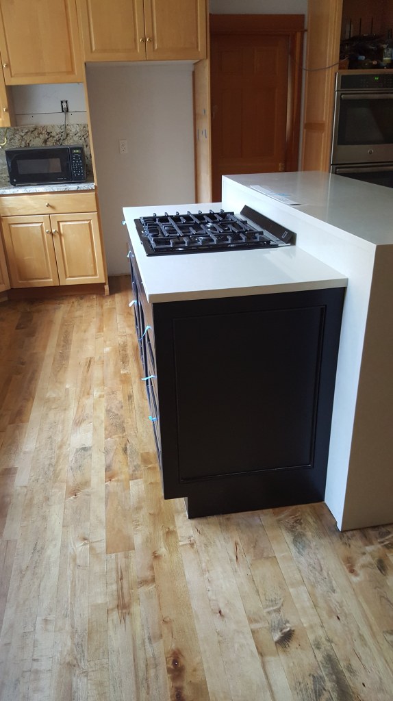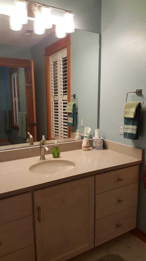 Inside… we reconfigured the back entry mudroom / laundry room area and kitchen island. We opened up walls and closed up an unnecessary door. Old wall to wall carpet was ripped up and replaced with wood flooring or new carpet. The old wood floors in the kitchen and dining room were stained and refinished. New tile floors were installed in the bathrooms and mudroom / laundry / powder room. Did I mention that all the walls and ceilings (I learned that the hard way) were painted the same light blue gray color? Well, we changed that too! All the walls and ceilings were repainted throughout the house. The massive brick fireplace / chimney in the center of the house got coated with tiles or reclaimed wood. Countertops were replaced with various stones and sinks, toilets & faucets were replaced. The house had only had can lights so new decorative light fixtures were installed and the cans that remained were replaced with LEDs. New woodwork and cabinetry was installed and some of the existing remaining cabinets were painted or refurbished and given new hardware.